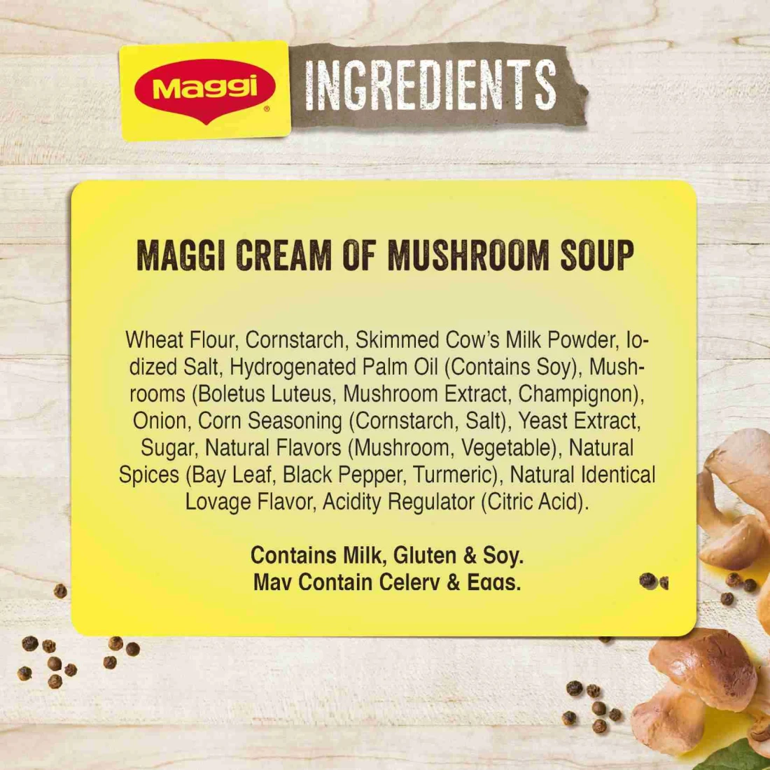 ingredients : Wheat Flour, Skimmed Cow's Milk Powder, lodized Salt, Mushrooms (Boletus Luteus, Mushroom Extract), Hydrogenated Palm Oil (Contains Soy), Natural Mushroom Flavour (Contains Milk), Corn Seasoning (Cornstarch, Salt), Onion Powder, Natural Identical Lovage Flavor, Natural Spices (Turmeric, Bay leaf, Black Pepper)