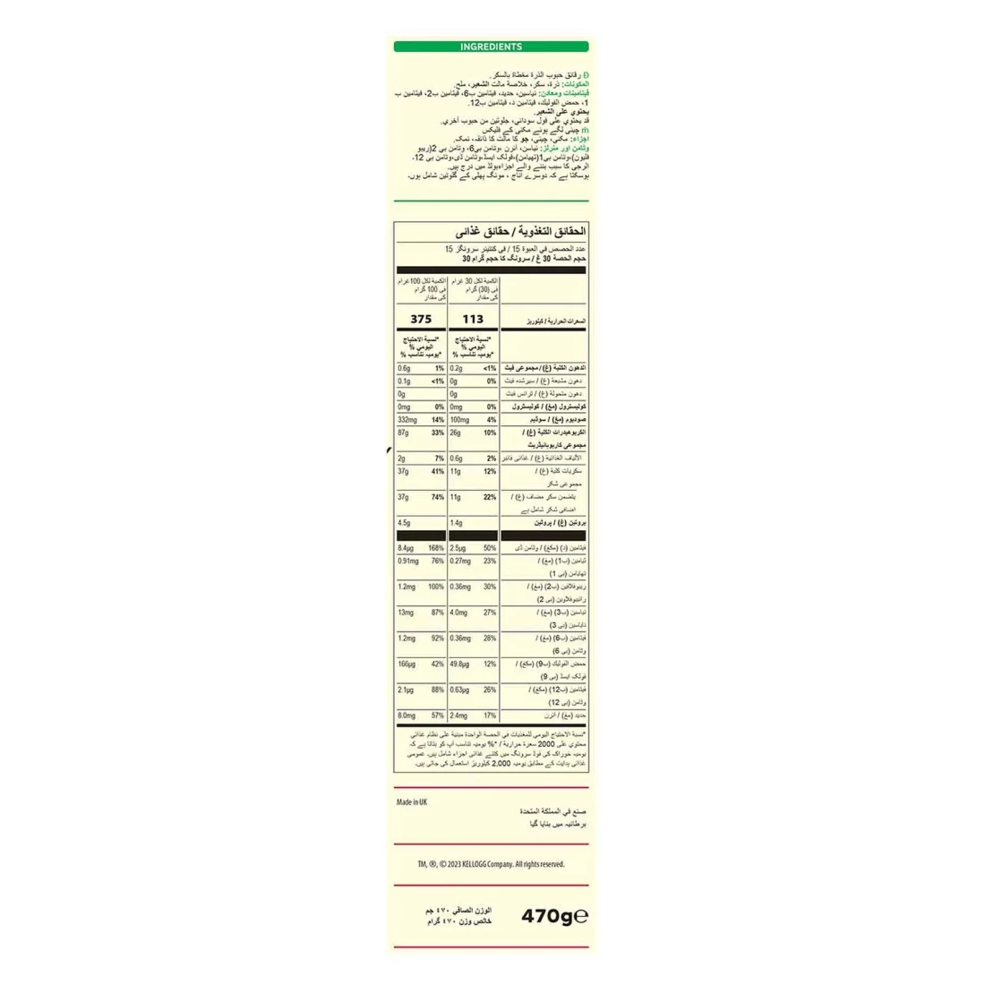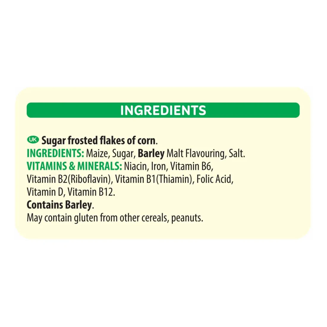 ingredients : Maize, Sugar, Barley Malt Flavouring, Salt. Vitamins & Minerals: Niacin, Iron, Vitamin B6, Vitamin B2 (Riboflavin), Vitamin B1(Thiamine), Folic Acid, Vitamin D, Vitamin B12