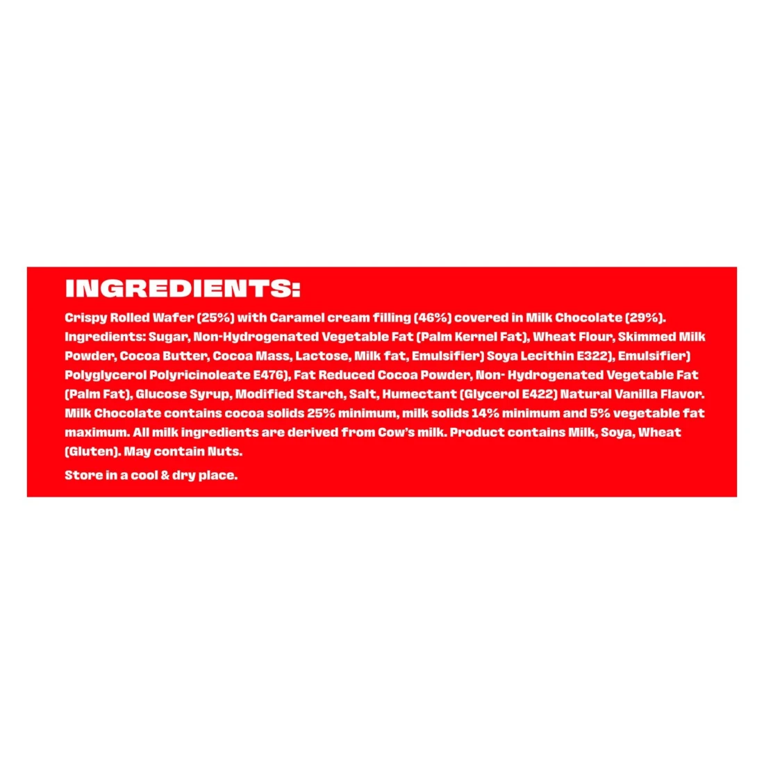 ingredients : Crispy Rolled Wafer (25%) With Caramel Cream Filling (46%) Covered In Milk Chocolate (29%). Ingredients: Sugar, Non-hydrogenated Vegetable Fat (Palm Kernel Fat), Wheat Flour, Skimmed Milk Powder, Cocoa Butter, Cocoa Mass, Lactose, Milk Fat, Emulsifier) Soya Lecithin E322), Emulsifier) Polyglycerol Polyricinoleate E476), Fat Reduced Cocoa Powder, Non-hydrogenated Vegetable Fat (Palm Fat), Glucose Syrup, Modified Starch, Salt, Humectant (Glycerol E422) Natural Vanilla Flavour. Milk Chocolate Contains Cocoa Solids 25% Minimum, Milk Solids 14% Minimum And 5% Vegetable Fat Maximum