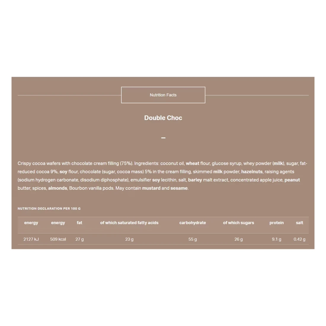 ingredients : Coconut Oil, Wheat Flour, Glucose Syrup, Whey Powder (Milk), Sugar, Fat- Reduced Cocoa 9%, Soy Flour, Chocolate (Sugar, Cocoa Mass) 5% In The Cream Filling, Skimmed Milk Powder, Hazelnuts, Raising Agents (Sodium Hydrogen Carbonate, Disodium Diphosphate), Emulsifier Soy Lecithin, Salt, Barley Malt Extract, Concentrated Apple Juice, Peanut Butter, Spices, Almonds, Bourbon Vanilla Pods