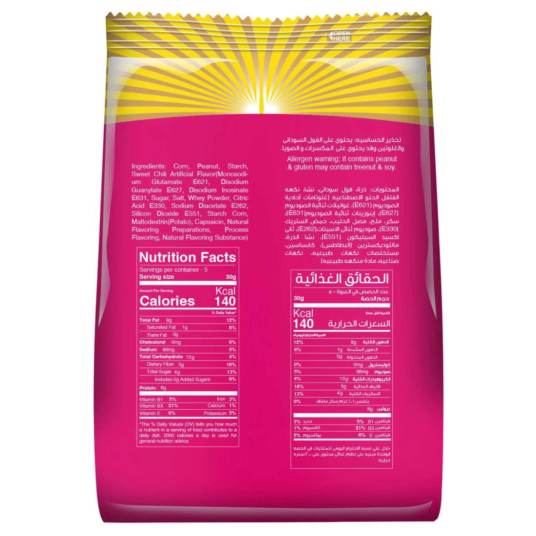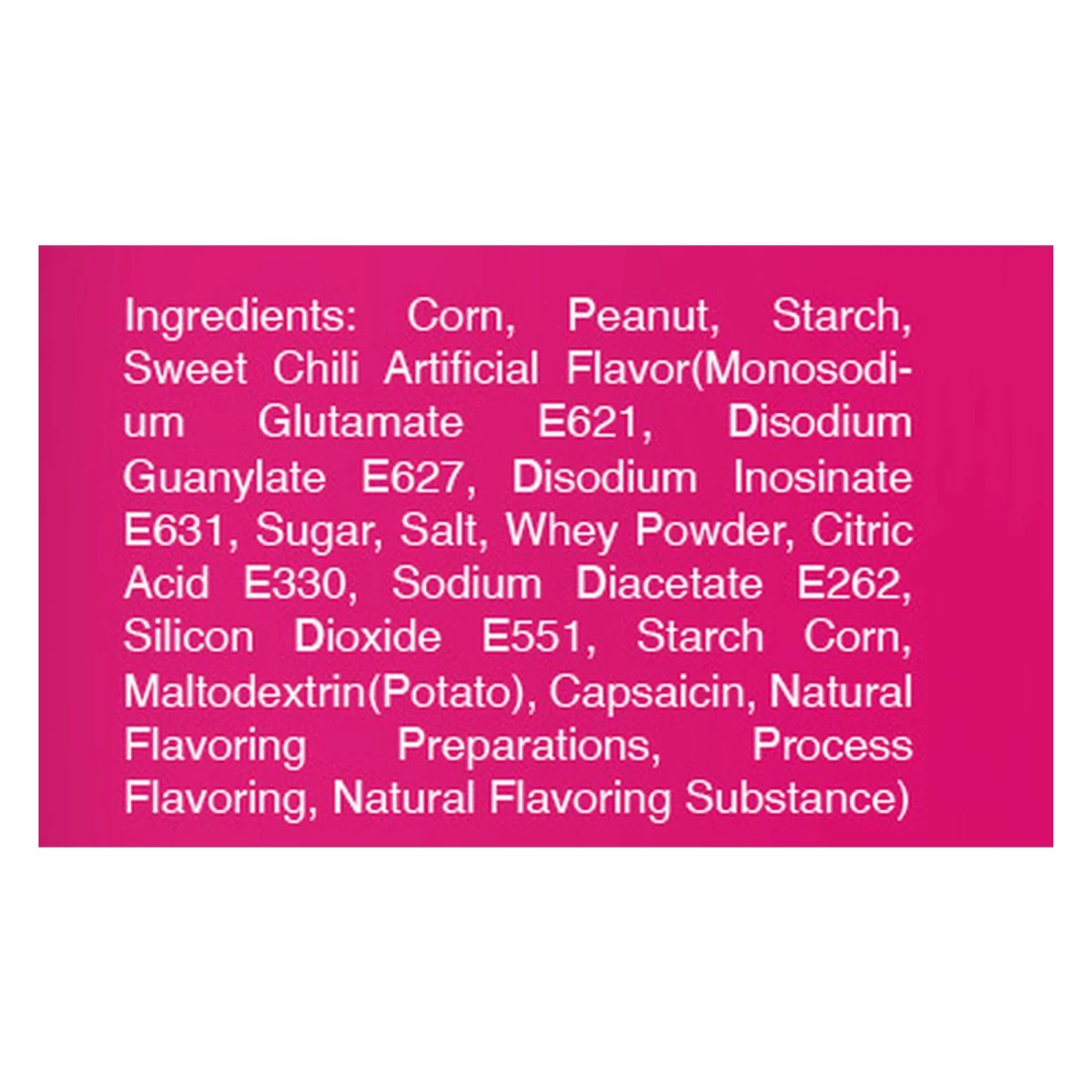 ingredients : Corn, Peanut, Starch, Sweet Chili Artificial Flavour(Monosodium Glutamate E621, Disodium Guanylate E627, Disodium Inosinate E631, Sugar, Salt, Whey Powder, Citric Acid E330, Sodium Diacetate E262, Silicon Dioxide E551, Starch Corn, Maltodextrin (Potato), Capsaicin, Natural Flavouring Preparations, Process Flavouring, Natural Flavouring Substance)