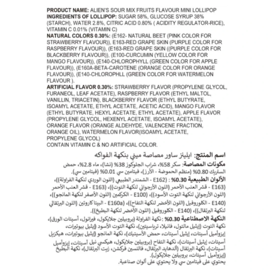 ingredients : Ingredients of Lollipop: Sugar 58%, Glucose Syrup 38% (Starch), Water 2.8%, Citric Acid 0.80% (Acidity Regulator-Rice), Vitamin C 0.01% (Vitamin C) Natural Colours 0.30%: (E162- Natural Beet (Pink Colour for Strawberry Flavour)), E163-Red Grape Skin (Purple Colour for Raspberry Flavour)), (E163-Red Grape Skin ((Purple Colour for Blackberry Flavour)), (E100-Curcumin (Yellow Colour for Mango Flavour)), (E140-Chlorophyll (Green Colour for Apple Flavour)), (E160a-Beta-Carotene (Orange Colour for Orange Flavour)), (E140-Chlorophll (Green Colour for Watermelon Flavour). Artificial Flavour 0.30%: Strawberry Flavour (Propylene Glycol, Furaneol, Leaf Acetate), Raspberry Flavour (Ethyl Maltitol, Vanillin, Triacetin), Blackberry Flavour (Ethyl Butyrate, Isoamyl Acetate, Ethyl Acetate, Acetic Acid), Mango Flavour (Ethyl Butyrate, Hexyl Acetate, Ethyl Acetate), Apple Flavour (Propylene Glycol, Hexenyl Acetate, Isoamyl Acetate), Orange Flavour (Orange Aldehyde, Valencene Fraction, Orange Oil), Watermelon Flavour (Isoamyl Acetate, Propylene Glycol) Contain Vitamin C & No Artificial Colour