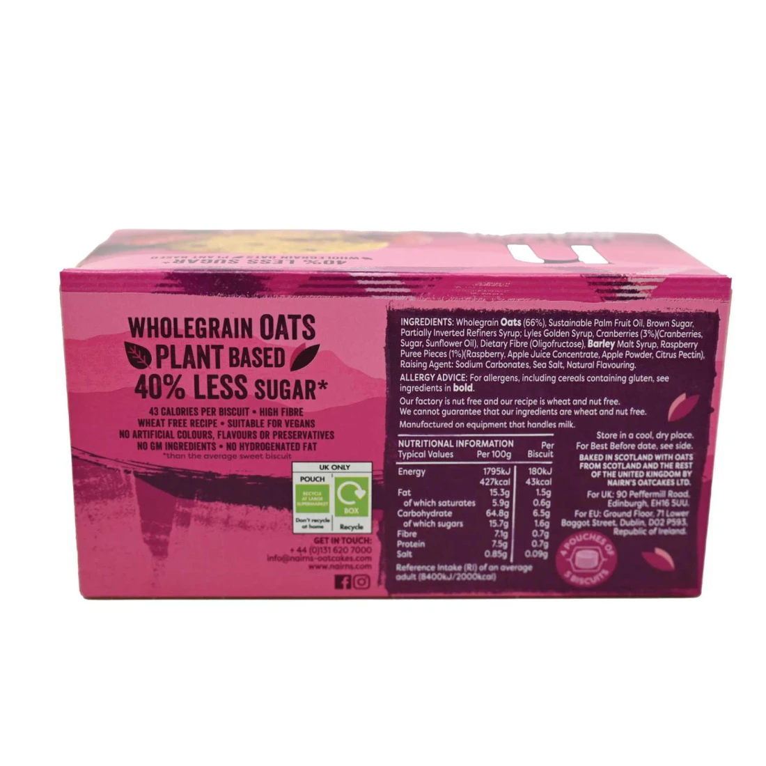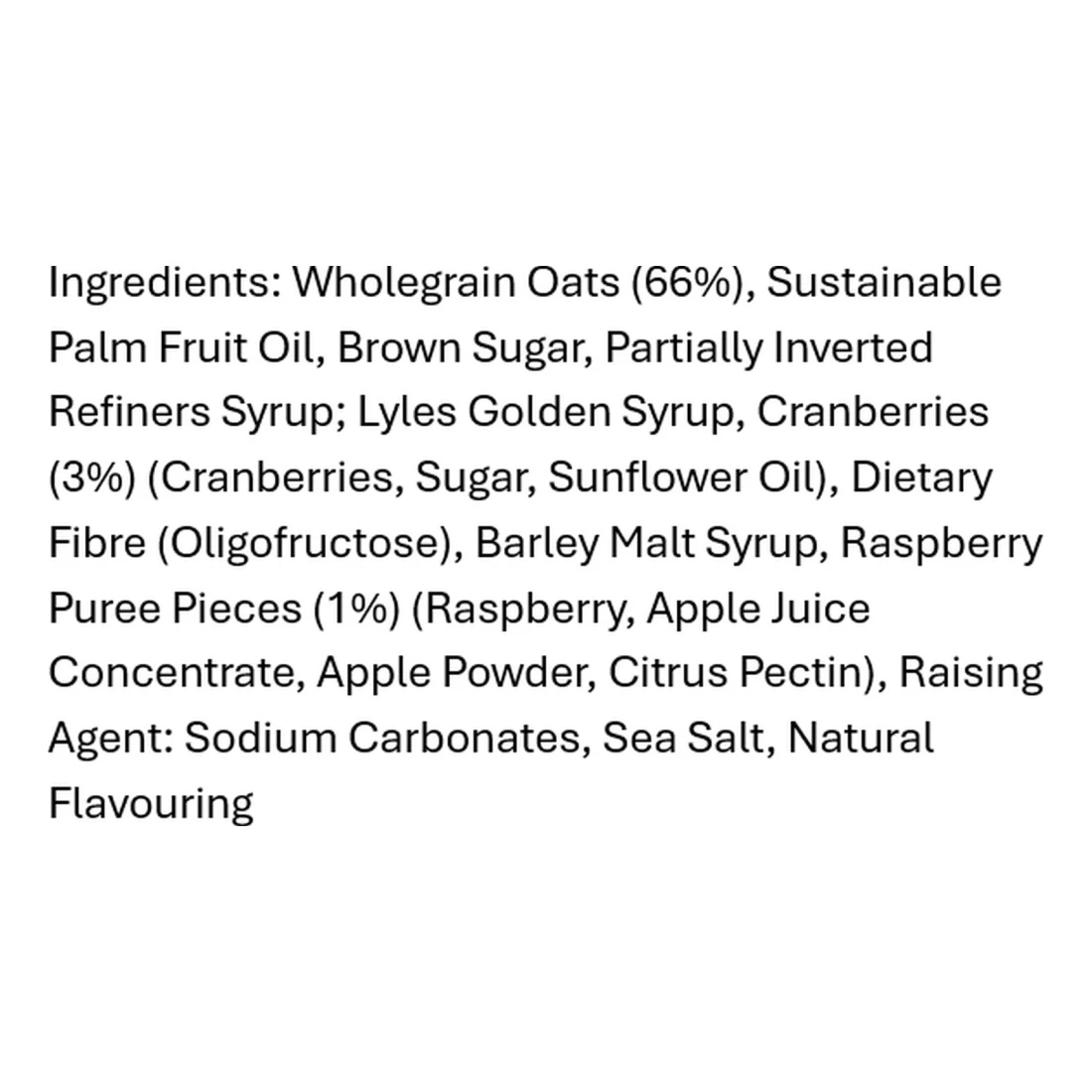 ingredients : Wholegrain Oats (66%), Sustainable Palm Fruit Oil, Brown Sugar, Partially Inverted Refiners Syrup; Lyles Golden Syrup, Cranberries (3%) (Cranberries, Sugar, Sunflower Oil), Dietary Fibre (Oligofructose), Barley Malt Syrup, Raspberry Puree Pieces (1%) (Raspberry, Apple Juice Concentrate, Apple Powder, Citrus Pectin), Raising Agent: Sodium Carbonates, Sea Salt, Natural Flavouring