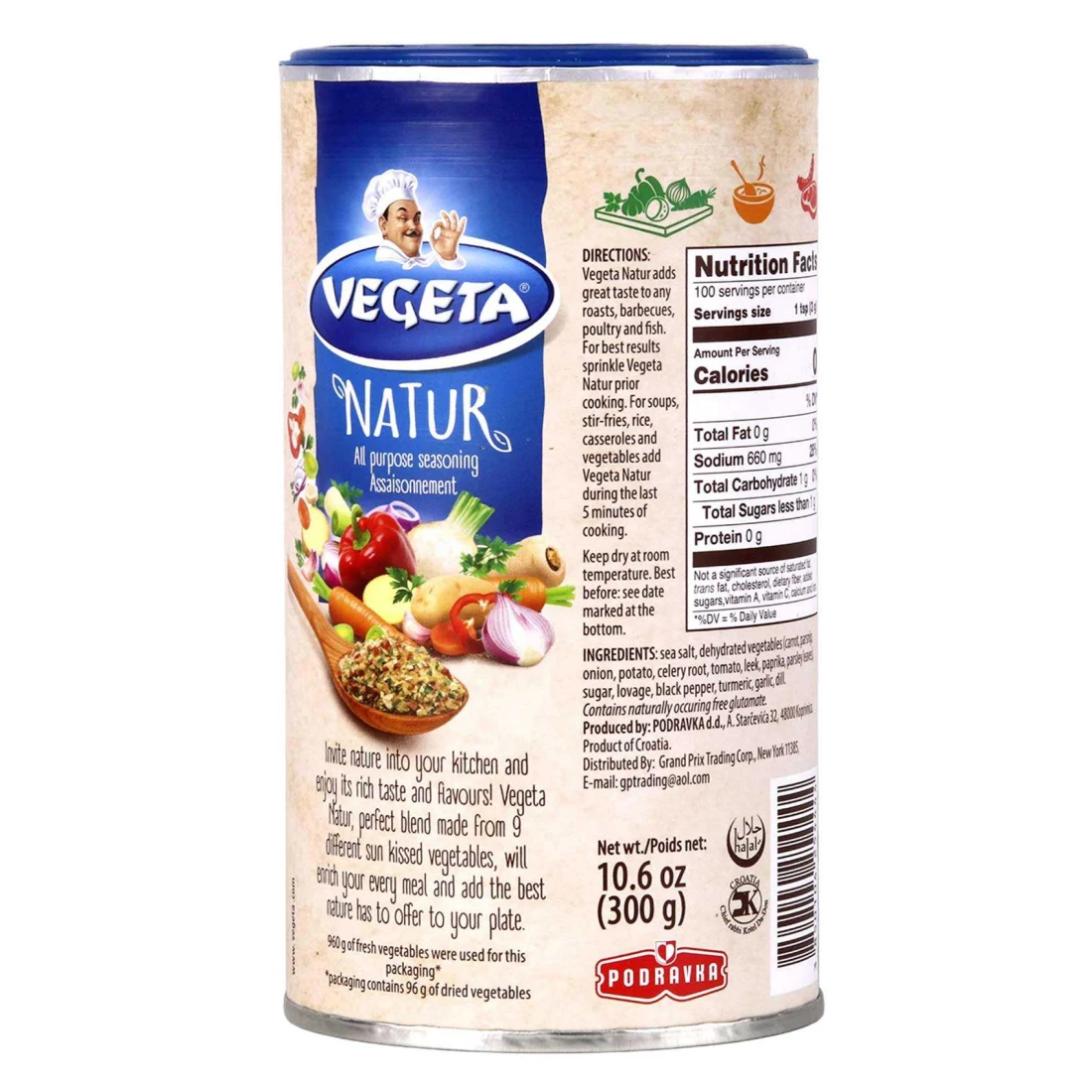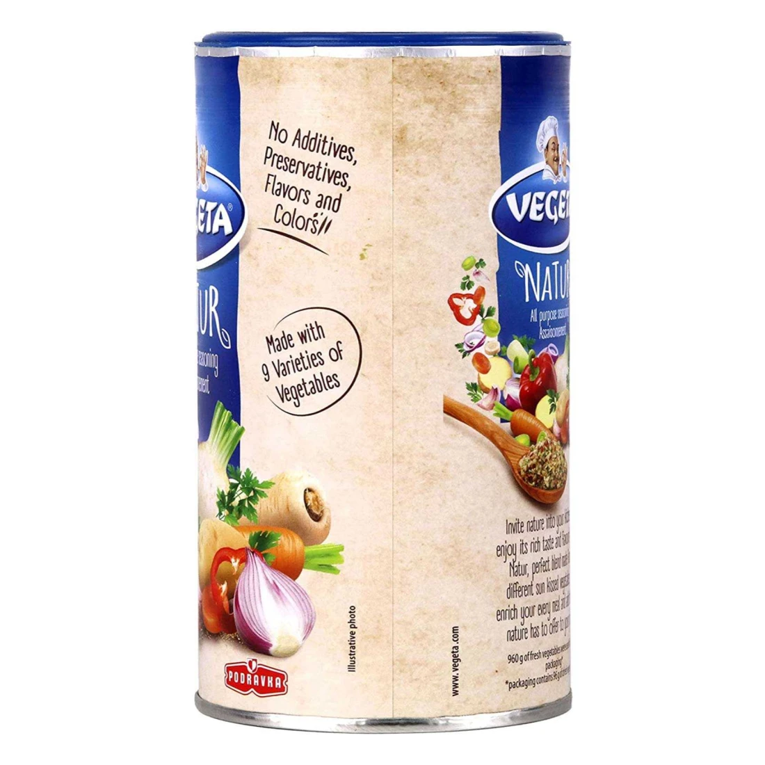 - Vegeta Natur is a product without the addition of preservatives and sodium without gluten without the addition of artificial flavours and colours and with a higher percentage of vegetables of 30%.