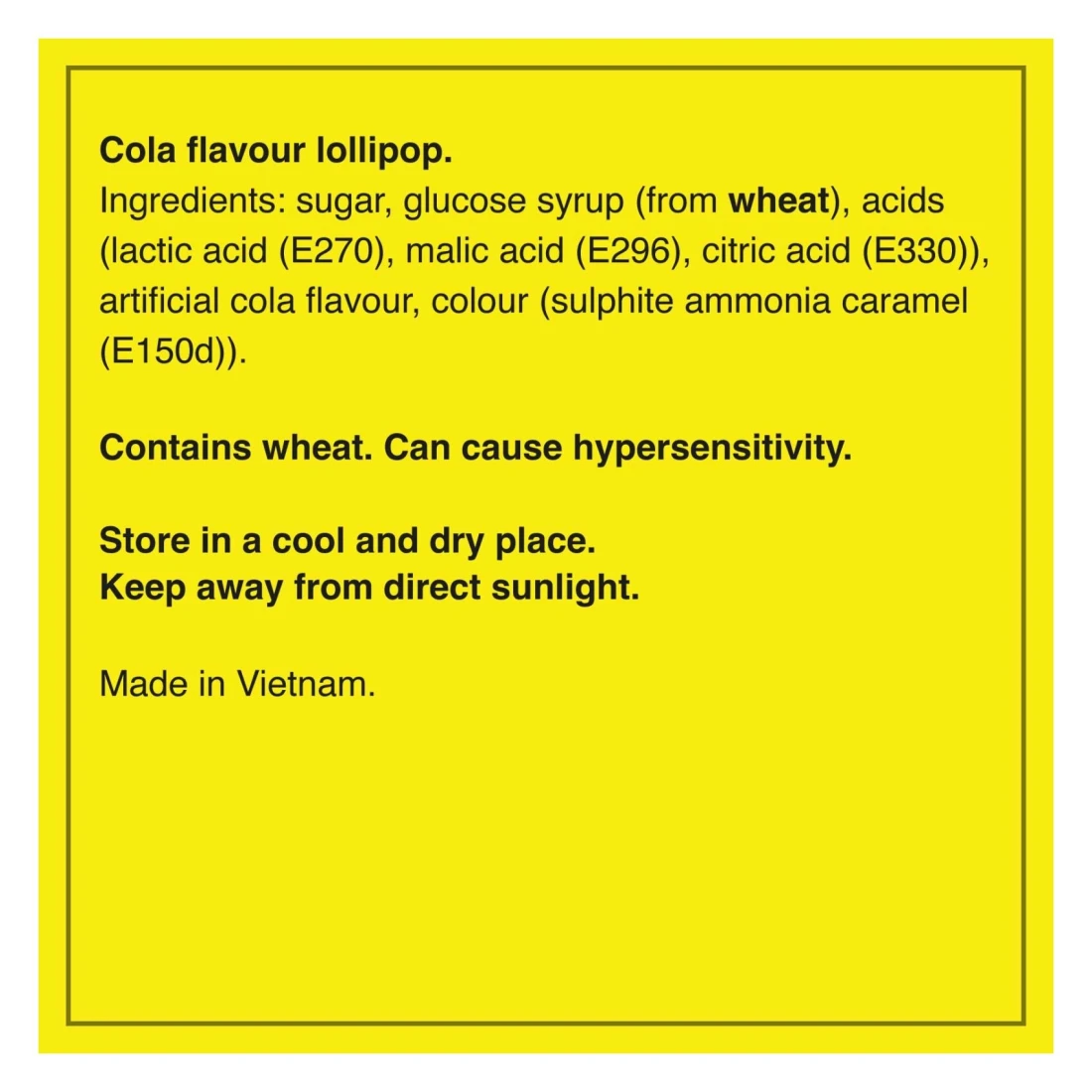 ingredients : Sugar, Glucose Syrup (From Wheat), Acids (Lactic Acid (E270), Malic Acid (E296), Citric Acid (E330)), Artificial Cola Flavour, Colour (Sulphite Ammonia Caramel (E150D))