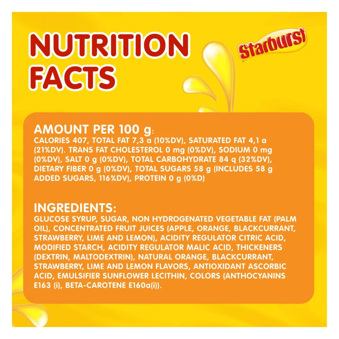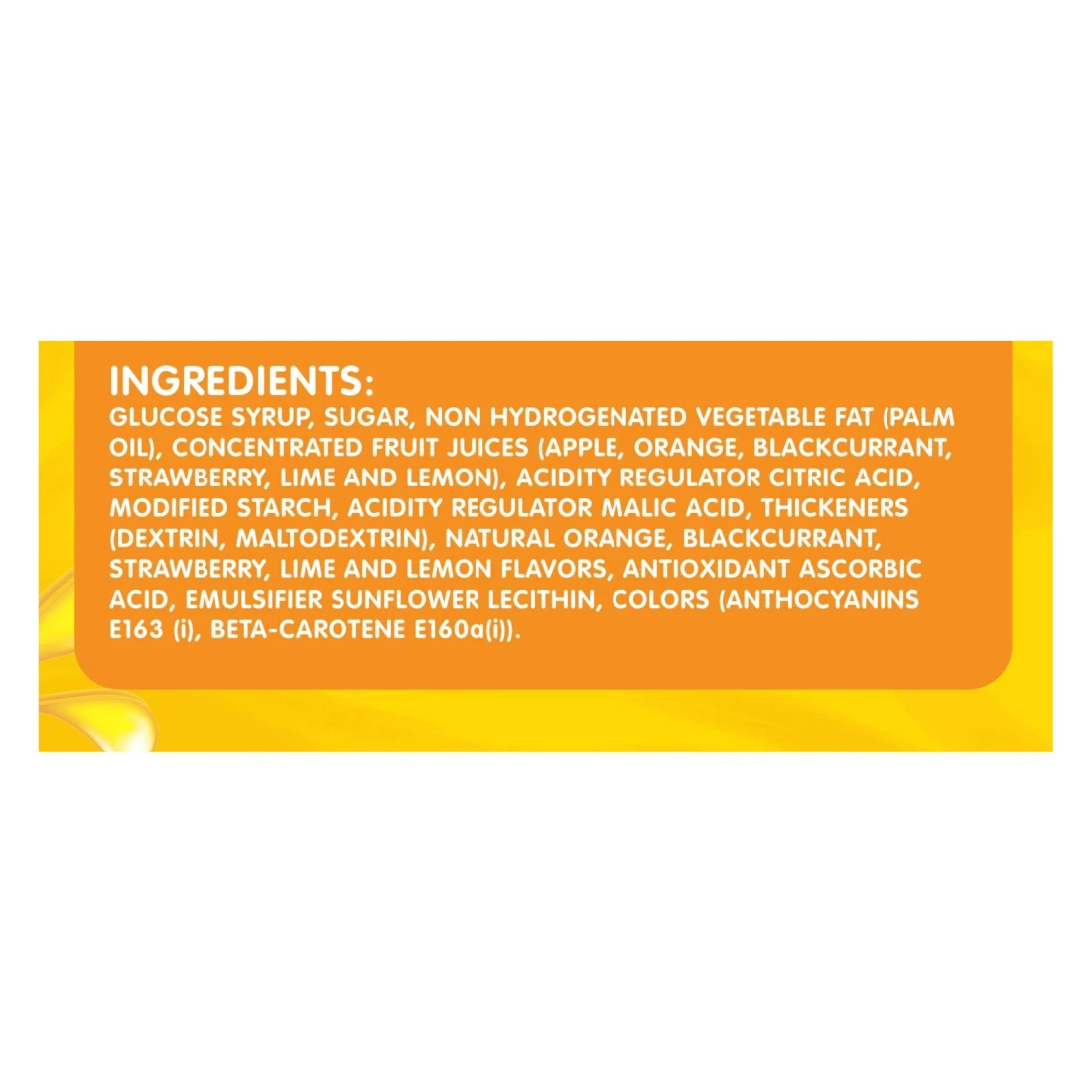 ingredients : Glucose Syrup, Sugar, Non Hydrogenated Vegetable Fat (Palm Oil), Concentrated Fruit Juices (Apple, Orange, Blackcurrant, Strawberry, Lime and Lemon), Acidity Regulator Citric Acid, Modified Starch, Acidity Regulator Malic Acid, Thickeners (Dextrin, Maltodextrin), Natural Orange, Blackcurrant, Strawberry, Lime and Lemon Flavours, Antioxidant Ascorbic Acid, Emulsifier Sunflower Lecithin, Colours (Anthocyanins E163 (I), Beta-Carotene E160a(i))