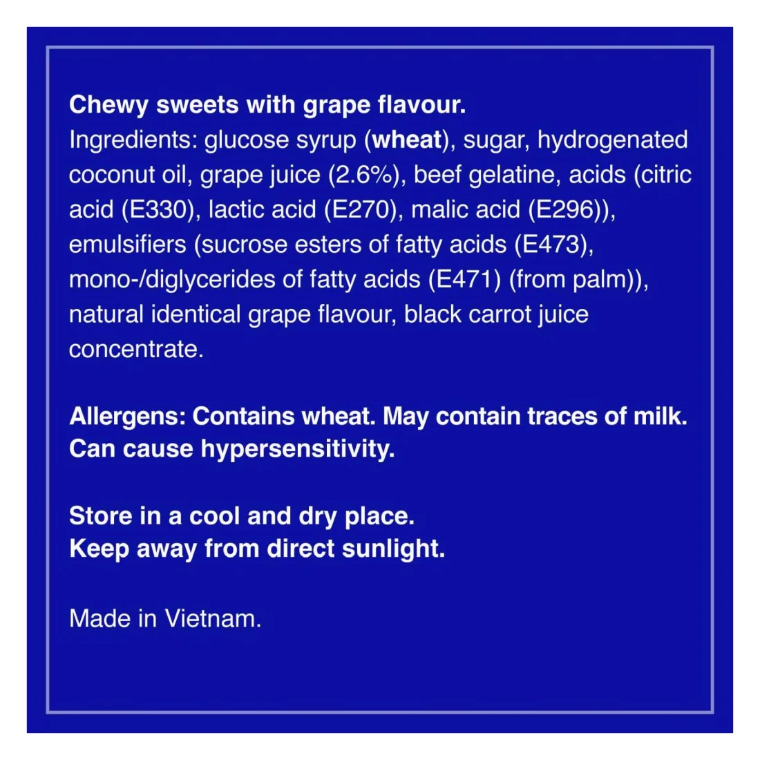 ingredients : Glucose Syrup (Wheat), Sugar, Hydrogenated Coconut Oil, Grape Juice (2.6%), Beef Gelatine, Acids (Citric Acid (E330), Lactic Acid (E270), Malic Acid (E296)), Emulsifiers (Sucrose Esters of Fatty Acids (E473), Mono-/Diglycerides of Fatty Acids (E471) (From Palm)), Natural Identical Grape Flavour, Black Carrot Juice Concentrate