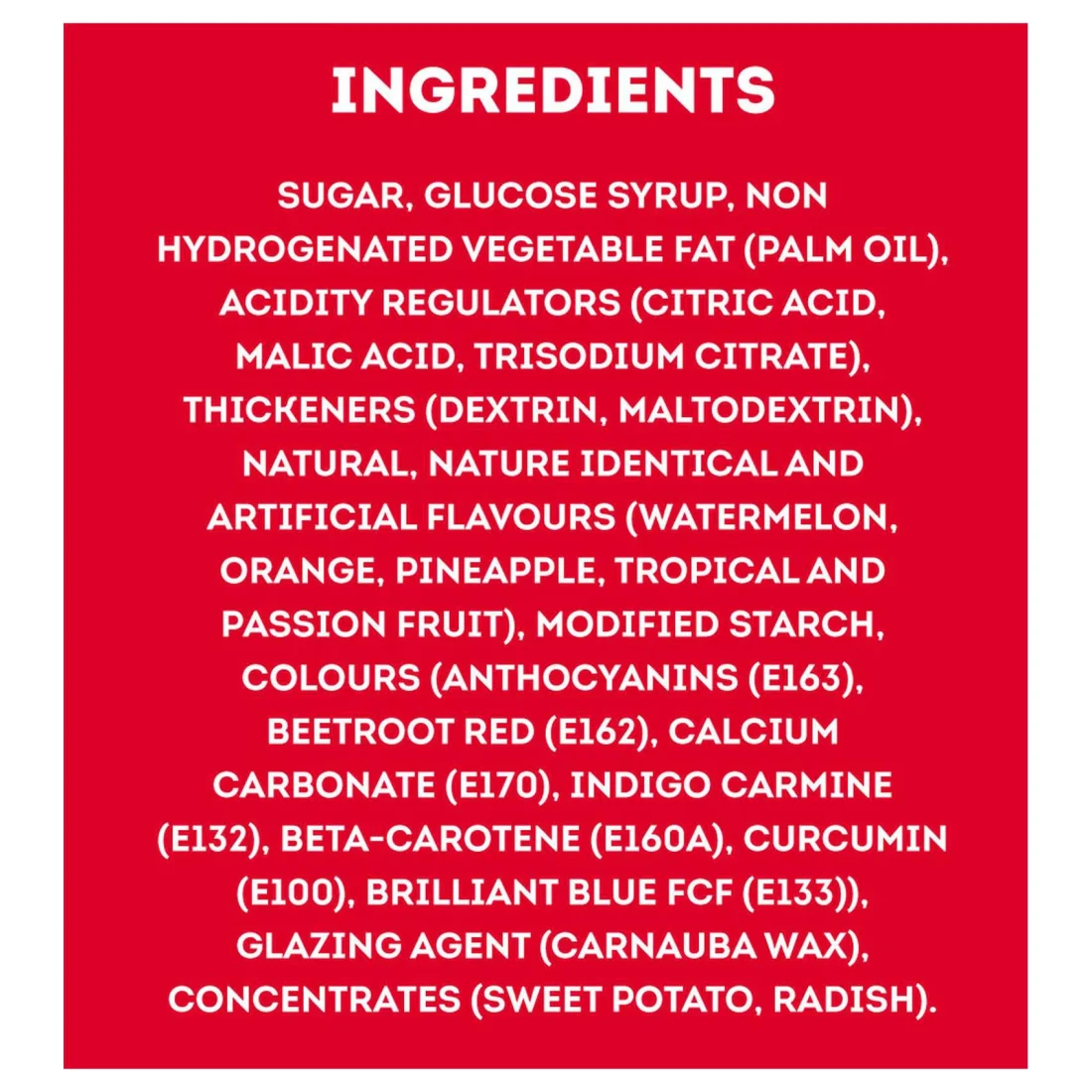 ingredients : Sugar, Glucose Syrup, Non Hydrogenated Vegetable Fat (Palm Oil). Acidity Regulators (Citric Acid. Malic Acid, Trisodium Citrate). Thickeners (Dextrin, Maltodextrin), Natural, Nature Identical And Artificial Flavours (Watermelon. Orange, Pineapple, Tropical And Passion Fruit), Modified Starch, Colours (Anthocyanins (E163), Beetroot Red (E162), Calcium Carbonate (E170), Indigo Carmine (E132), Beta-carotene (E160A), Curcumin (E100), Brilliant Blue Fcf (E133)). Glazing Agent (Carnauba Wax). Concentrates (Sweet Potato, Radish)