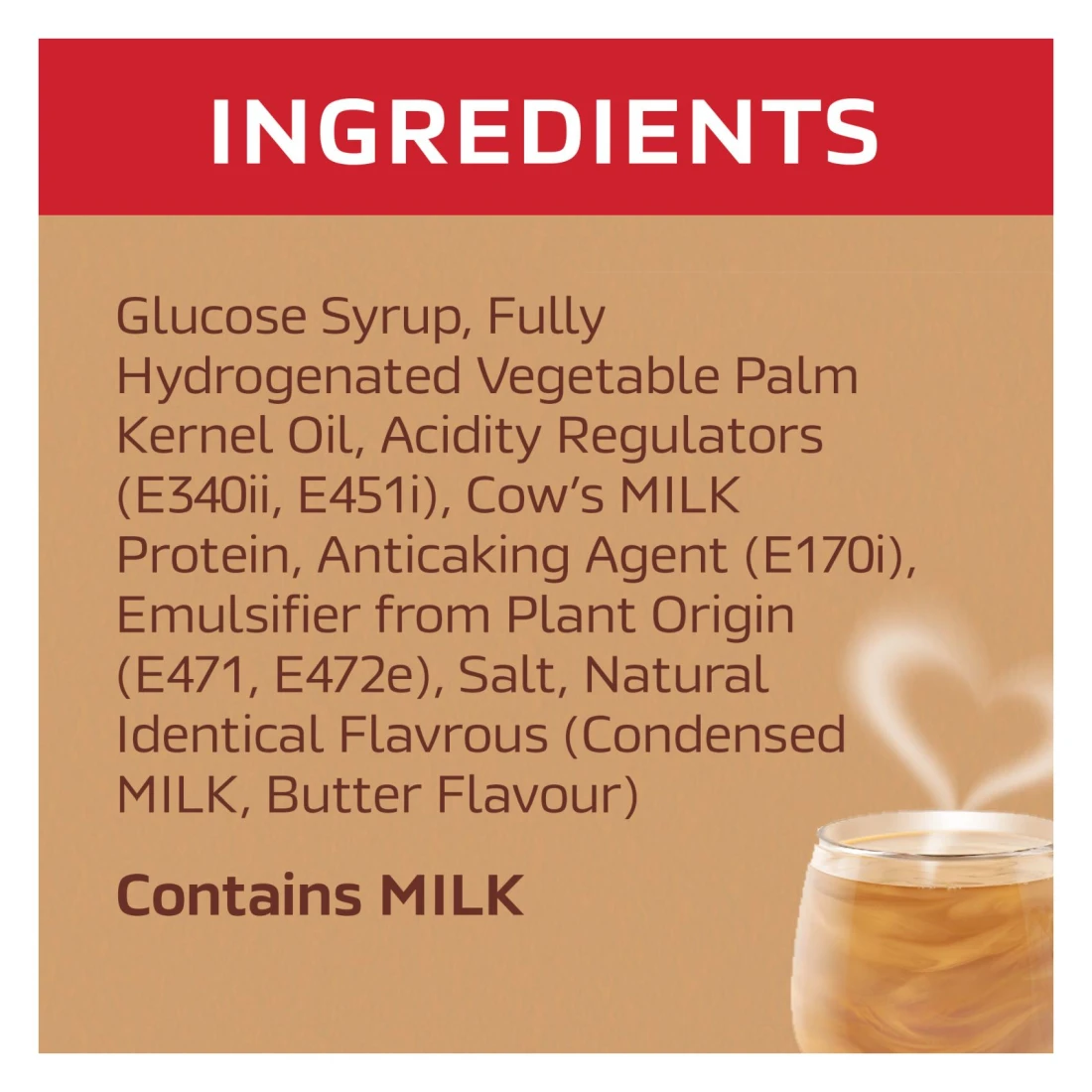 ingredients : Glucose Syrup, Fully Hydrogenated Vegetable Palm Kernel Oil, Acidity Regulators (E340ii, E451i), Cow's Milk Protein, Anticaking Agent (E170i), Emulsifier from Plant Origin (E471, E472e), Salt, Natural Identical Flavors (Condensed MILK, Butter Flavour)