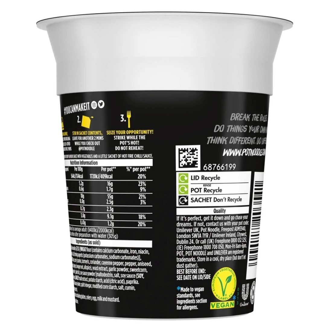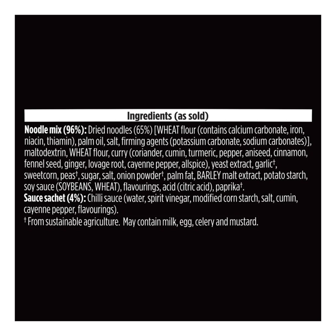 ingredients : Noodle Mix (96%): Dried Noodles (69%) [Wheat Flour (Contains Calcium Carbonate, Iron, Niacin, Thiamine), Palm Oil, Salt, Firming Agents (Potassium Carbonate, Sodium Carbonates)], Sugar, Potato Starch, Maltodextrin, Carrots, Peas, Apple Powder, Tomato Powder, Red Pepper, Onion Powder, Acids (Citric Acid, Tartaric Acid), Flavour Enhancers (Monosodium Glutamate, Disodium Inosinate, Disodium Guanylate), Salt, Acidity Regulator (Sodium Diacetate), Flavourings, Palm Fat, Garlic Powder, Ginger, Turmeric, Soy Sauce (Soybeans, Wheat), Stabiliser (Calcium Phosphates). Sauce Sachet (4%): Sweet & Sour Sauce [Water, Sugar, Barley Malt Vinegar, Tomato Paste, Modified Corn Starch, Salt, Onions, Acid (Citric Acid), Soy Sauce (Water, Salt, Sugar, Barley Malt Vinegar, Barley Malt Extract, Soybeans), Lemon Juice Concentrate, Ginger Extract