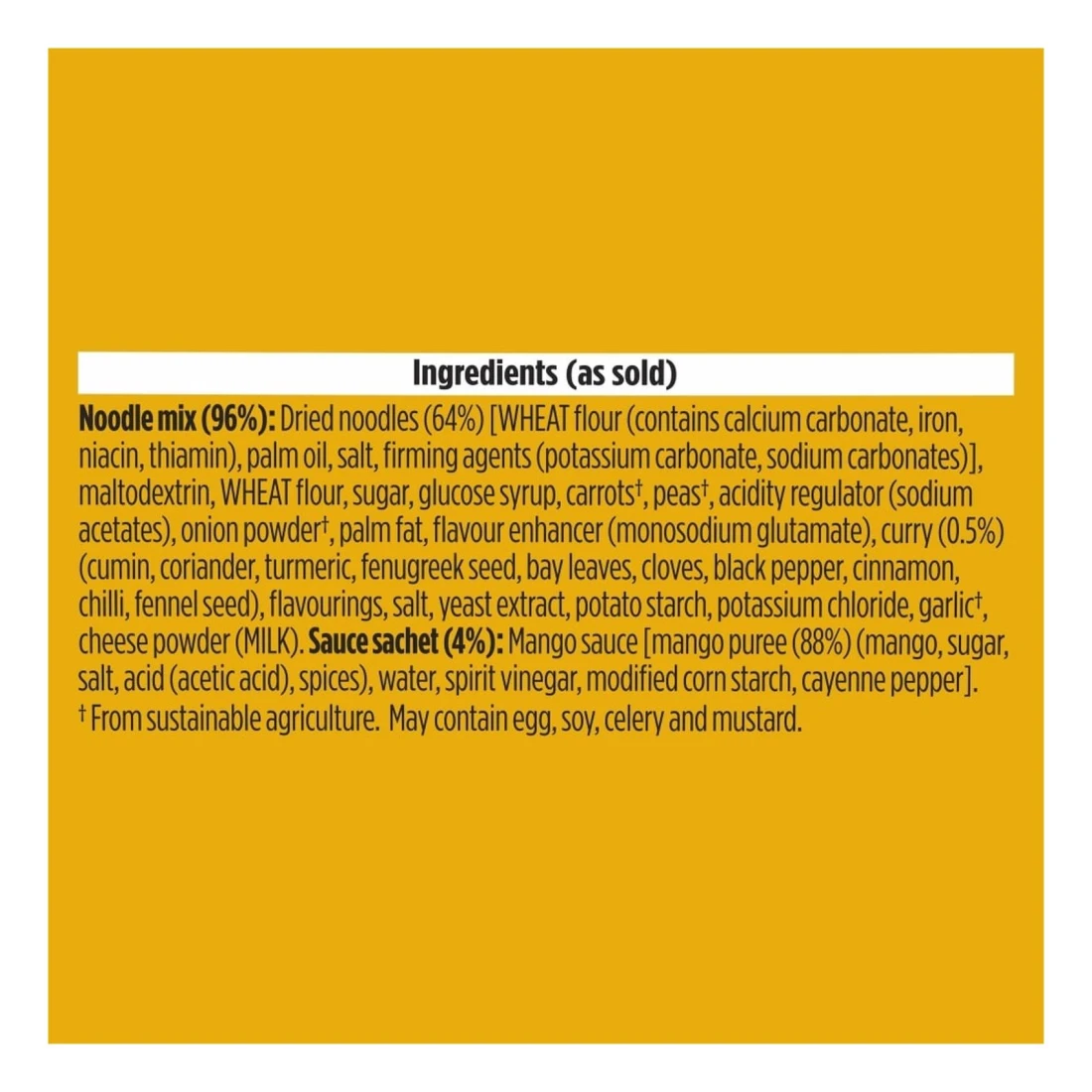 ingredients : Noodle Mix (96%): Dried Noodles (69%) [Wheat Flour (Contains Calcium Carbonate, Iron, Niacin, Thiamine), Palm Oil, Salt, Firming Agents (Potassium Carbonate, Sodium Carbonates)], Sugar, Potato Starch, Maltodextrin, Carrots, Peas, Apple Powder, Tomato Powder, Red Pepper, Onion Powder, Acids (Citric Acid, Tartaric Acid), Flavour Enhancers (Monosodium Glutamate, Disodium Inosinate, Disodium Guanylate), Salt, Acidity Regulator (Sodium Diacetate), Flavourings, Palm Fat, Garlic Powder, Ginger, Turmeric, Soy Sauce (Soybeans, Wheat), Stabiliser (Calcium Phosphates). Sauce Sachet (4%): Sweet & Sour Sauce [Water, Sugar, Barley Malt Vinegar, Tomato Paste, Modified Corn Starch, Salt, Onions, Acid (Citric Acid), Soy Sauce (Water, Salt, Sugar, Barley Malt Vinegar, Barley Malt Extract, Soybeans), Lemon Juice Concentrate, Ginger Extract