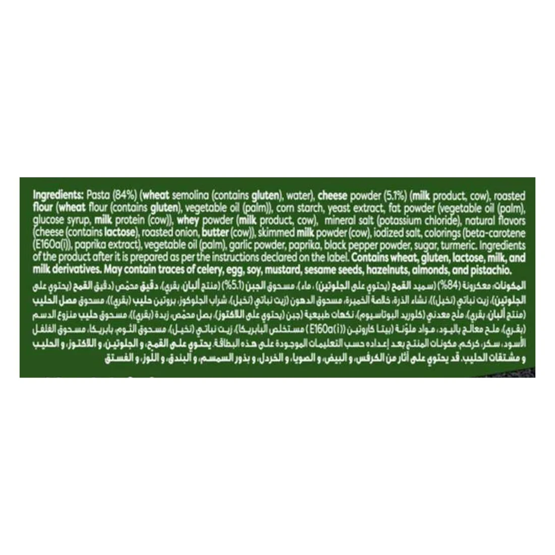 ingredients : Pasta (84%) (Wheat Semolina (Contains Gluten), Water), Cheese Powder (5.1%) (Milk Product, Cow), Roasted Flour (Wheat Flour (Contains Gluten), Vegetable Oil (Palm)), Corn Starch, Yeast Extract, Fat Powder (Vegetable Oil (Palm), Glucose Syrup, Milk Protein (Cow)), Whey Powder (Milk Product, Cow), Mineral Salt (Potassium Chloride), Natural Flavours (Cheese (Contains Lactose), Roasted Onion, Butter (Cow)), Skimmed Milk Powder (Cow), Iodized Salt, Colourings (Beta-carotene (E160A(I)), Paprika Extract), Vegetable Oil (Palm), Garlic Powder, Paprika, Black Pepper Powder, Sugar, Turmeric