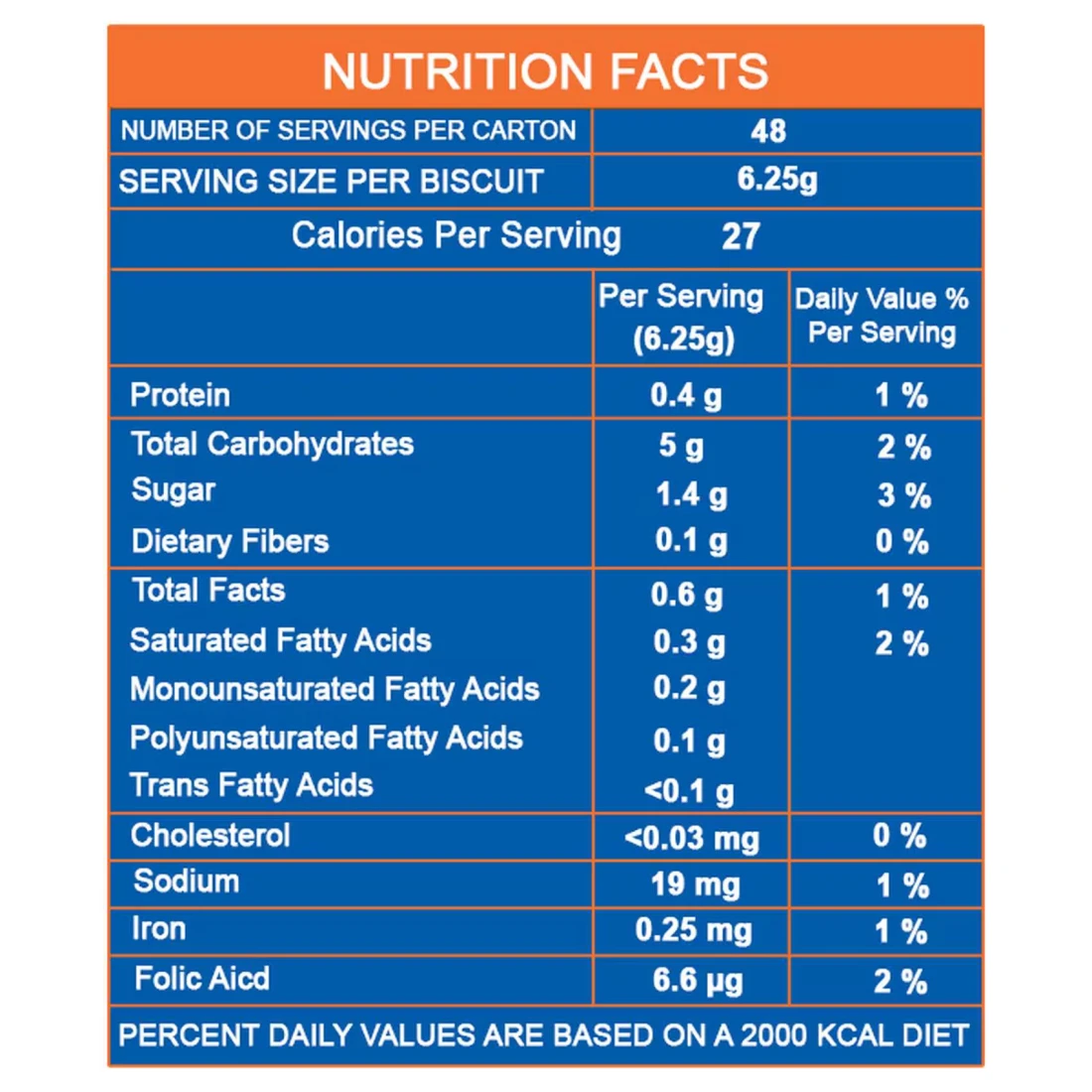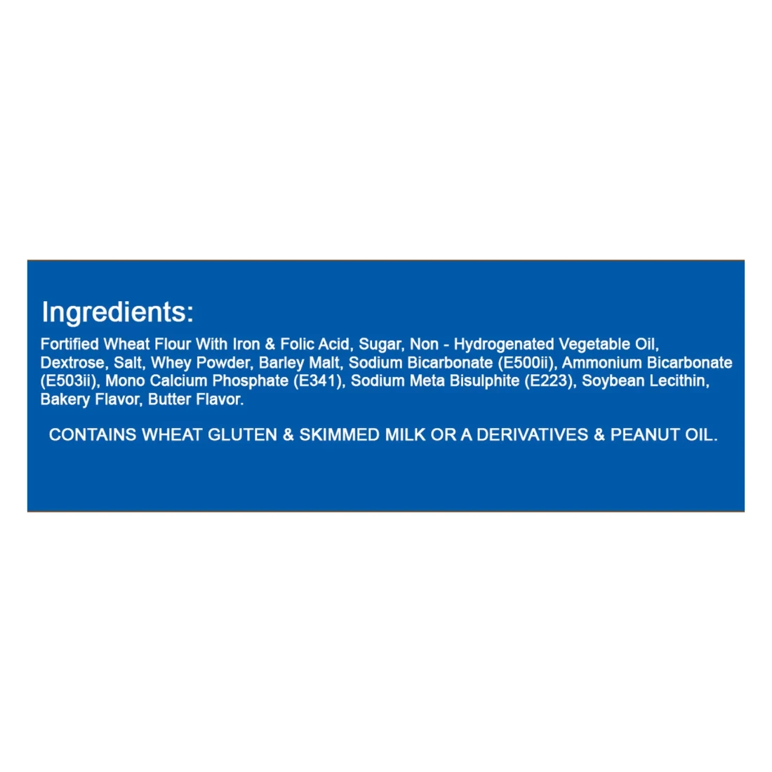 ingredients : Fortified Wheat Flour With Iron & Folic Acid, Sugar, Non - Hydrogenated Vegetable Oil, Dextrose, Salt, Whey Powder, Barley Malt, Sodium Bicarbonate (E500Ii), Ammonium Bicarbonate (E503Ii), Mono Calcium Phosphate (E341), Sodium Meta Bisulphite (E223), Soybean Lecithin, Bakery Flavour, Butter Flavour
