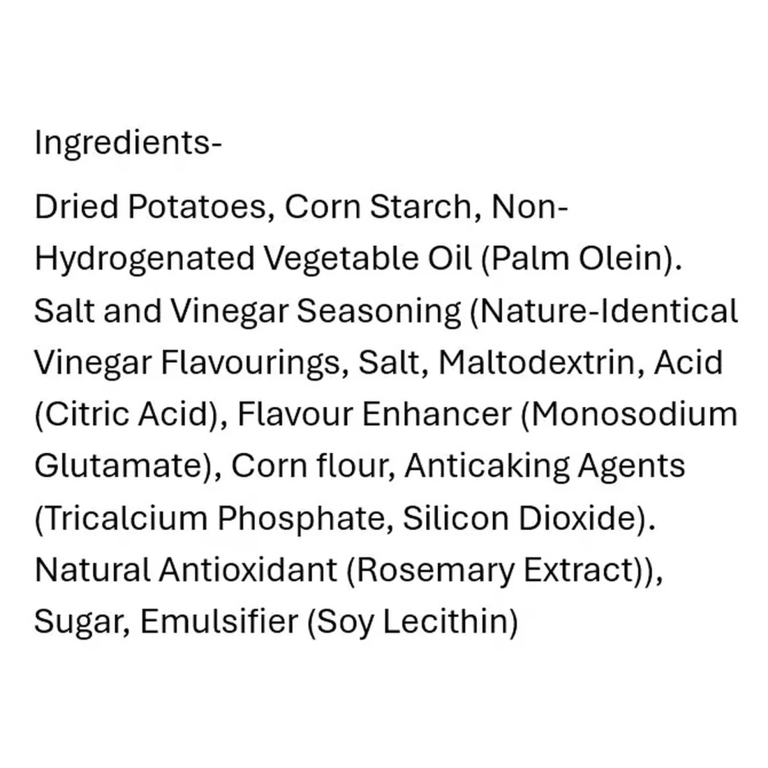 ingredients : Dried Potatoes, Corn Starch, Non-Hydrogenated Vegetable Oil (Palm Olein). Salt and Vinegar Seasoning (Nature-Identical Vinegar Flavourings, Salt, Maltodextrin, Acid (Citric Acid), Flavour Enhancer (Monosodium Glutamate), Corn flour, Anticaking Agents (Tricalcium Phosphate, Silicon Dioxide). Natural Antioxidant (Rosemary Extract)), Sugar, Emulsifier (Soy Lecithin)