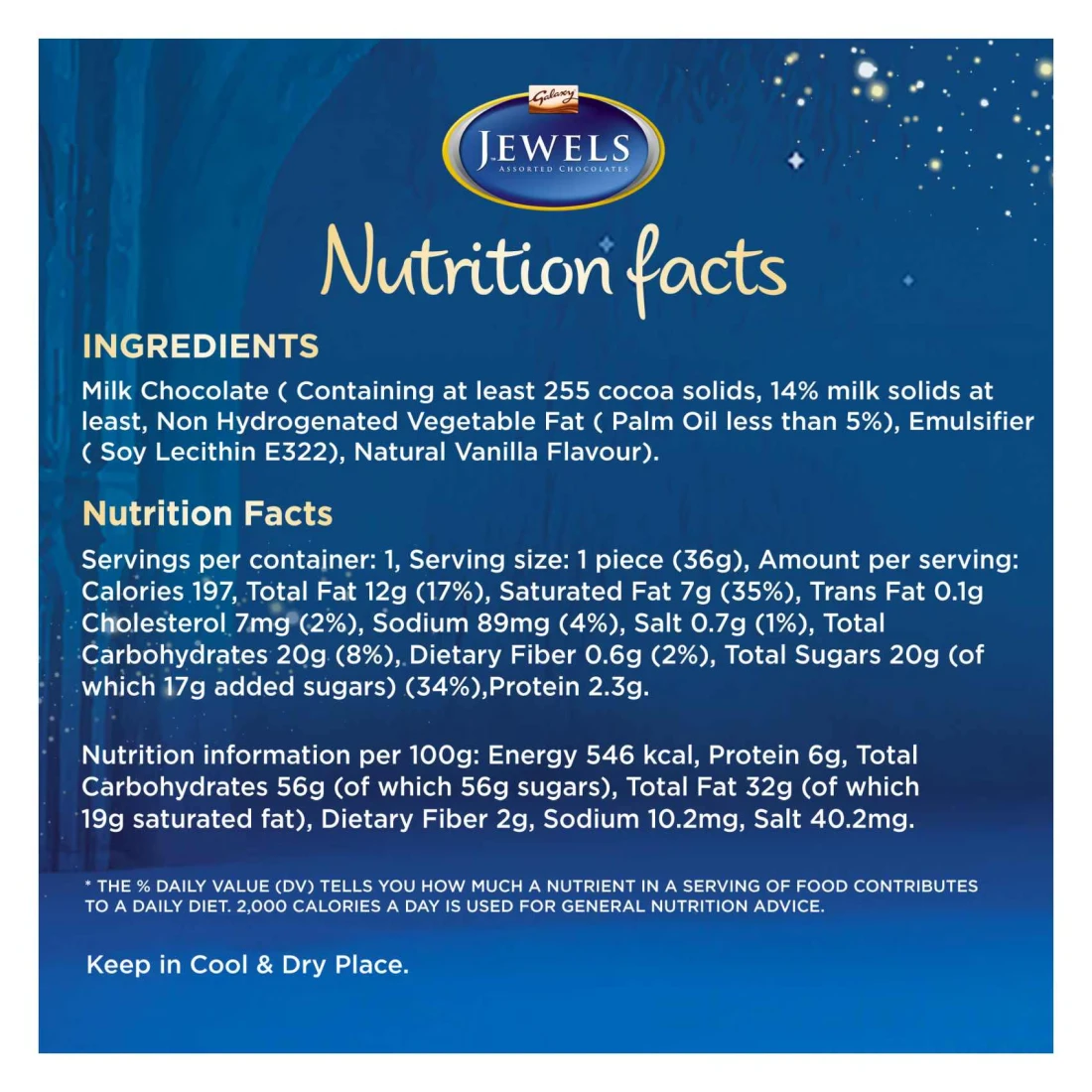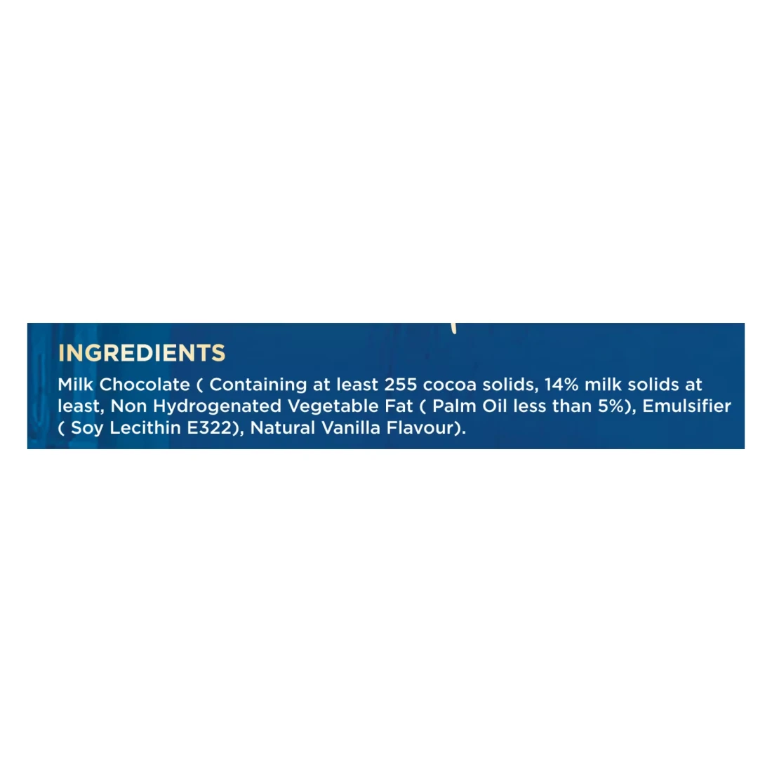 ingredients : Milk Chocolate (Containing at Least 255 Cocoa Solids, 14% Milk Solids at Least, Non-Hydrogenated Vegetable Fat (Palm Oil Less Than 5%), Emulsifier (Soy Lecithin E322), Natural Vanilla Flavour)