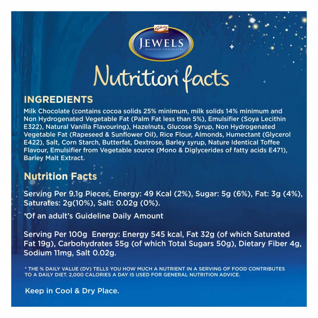 ingredients : Milk Chocolate (Contains Cocoa Solids 25% Minimum, Milk Solids 14% Minimum and Non-Hydrogenated Vegetable Fat (Palm Fat Less Than 5%), Emulsifier (Soya Lecithin E322), Natural Vanilla Flavouring), Hazelnuts, Glucose Syrup, Non-Hydrogenated Vegetable Fat (Rapeseed & Sunflower Oil), Rice Flour, Almonds, Humectant (Glycerol E422), Salt, Corn Starch, Butterfat, Dextrose, Barley Syrup, Nature Identical Toffee Flavour, Emulsifier From Vegetable Source (Mono & Diglycerides of Fatty Acids E471), Barley Malt Extract