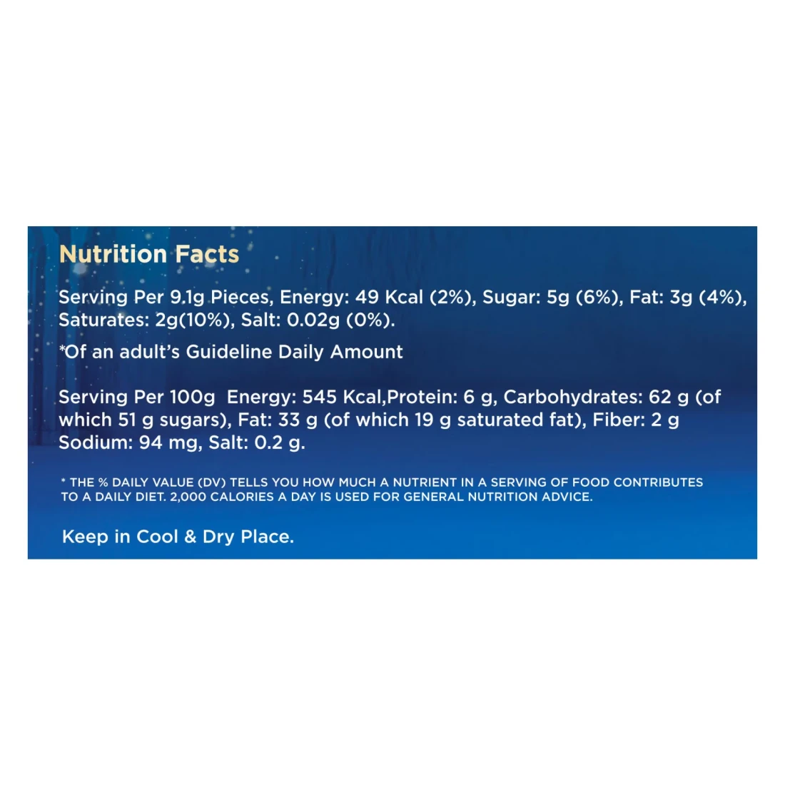 ingredients : Milk Chocolate (Contains Cocoa Solids 25% Minimum, Milk Solids 14% Minimum, and Non-Hydrogenated Vegetable Fat (Palm Fat Less Than 5%), Emulsifier (Soya Lecithin E322), Natural Vanilla Flavouring), Hazelnuts, Glucose Syrup, Non-Hydrogenated Vegetable Fat (Rapeseed & Sunflower Oil), Rice Flour, Almonds, Humectant (Glycerol E422), Salt, Corn Starch, Butterfat, Dextrose, Barely Syrup, Nature Identical Toffee Flavour, Emulsifier From Vegetable Source (Mono & Diglycerides of Fatty Acids E471), Barely Malt Extract