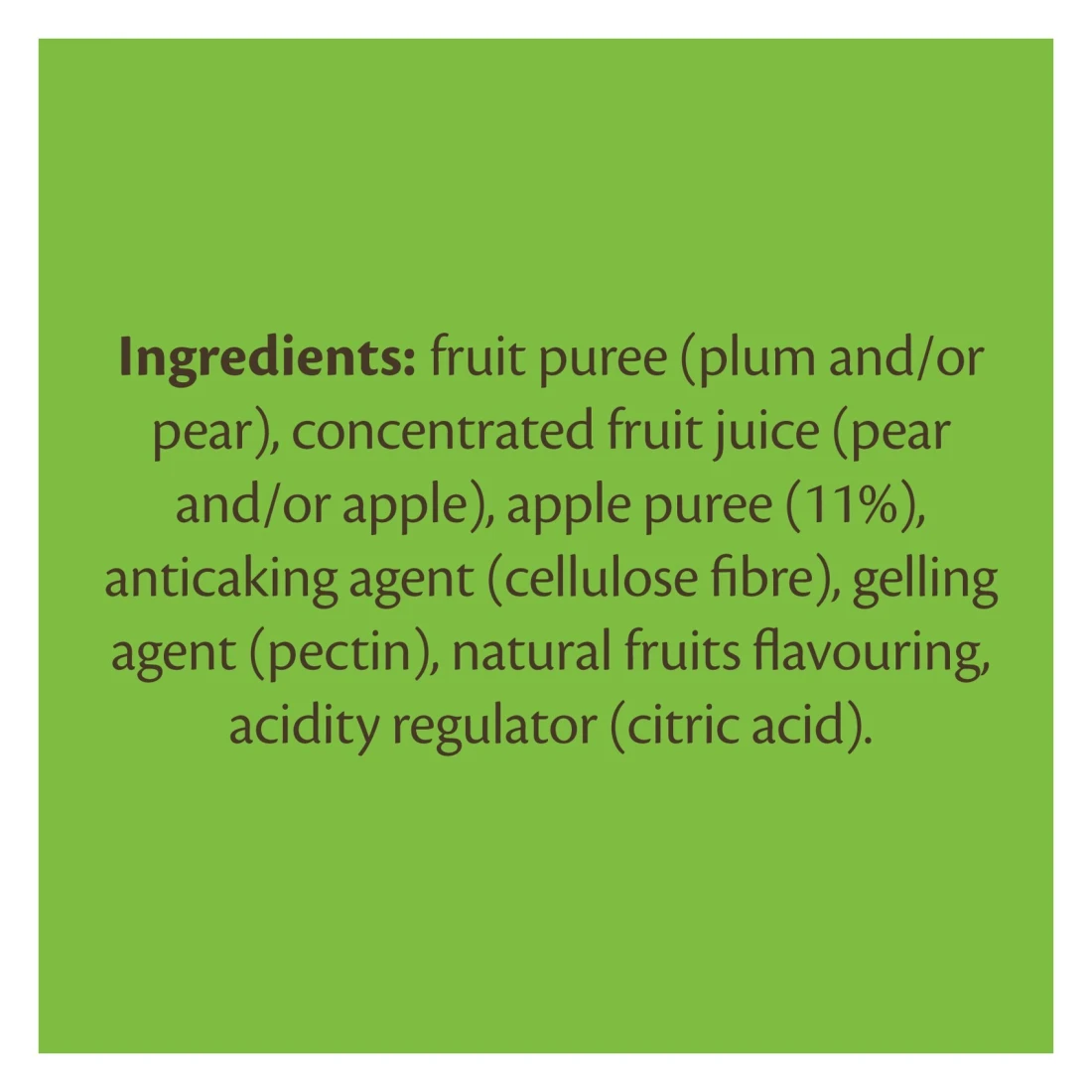 ingredients : Fruit Puree (Plum And/Or Pear), Concentrated Fruit Juice (Pear And/Or Apple), Apple Puree (11%), Anticaking Agent (Cellulose Fibre), Gelling Agent (Pectin), Natural Fruits Flavouring, Acidity Regulator (Citric Acid)
