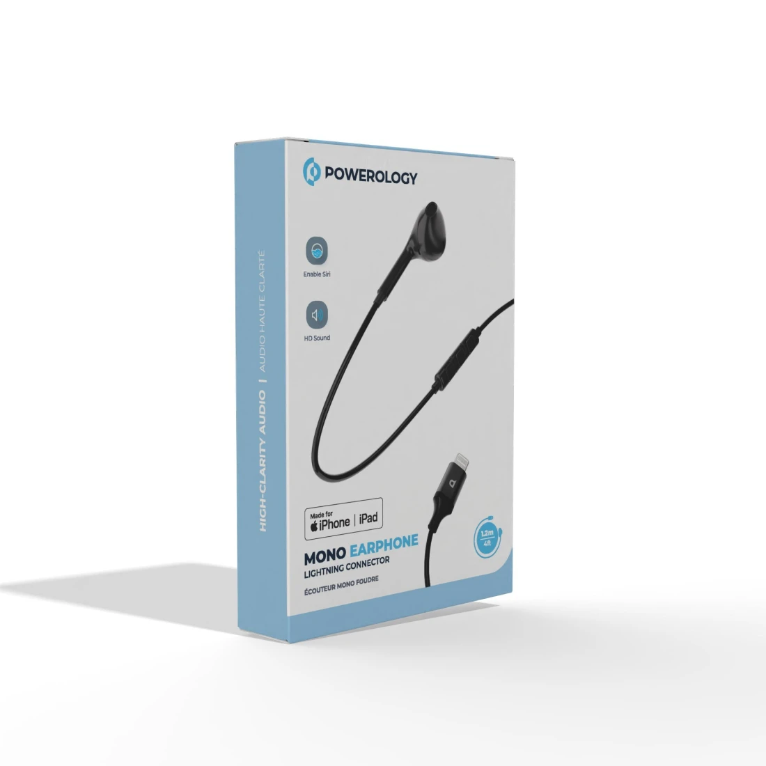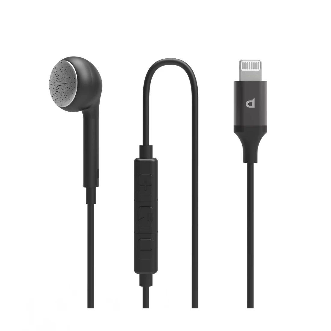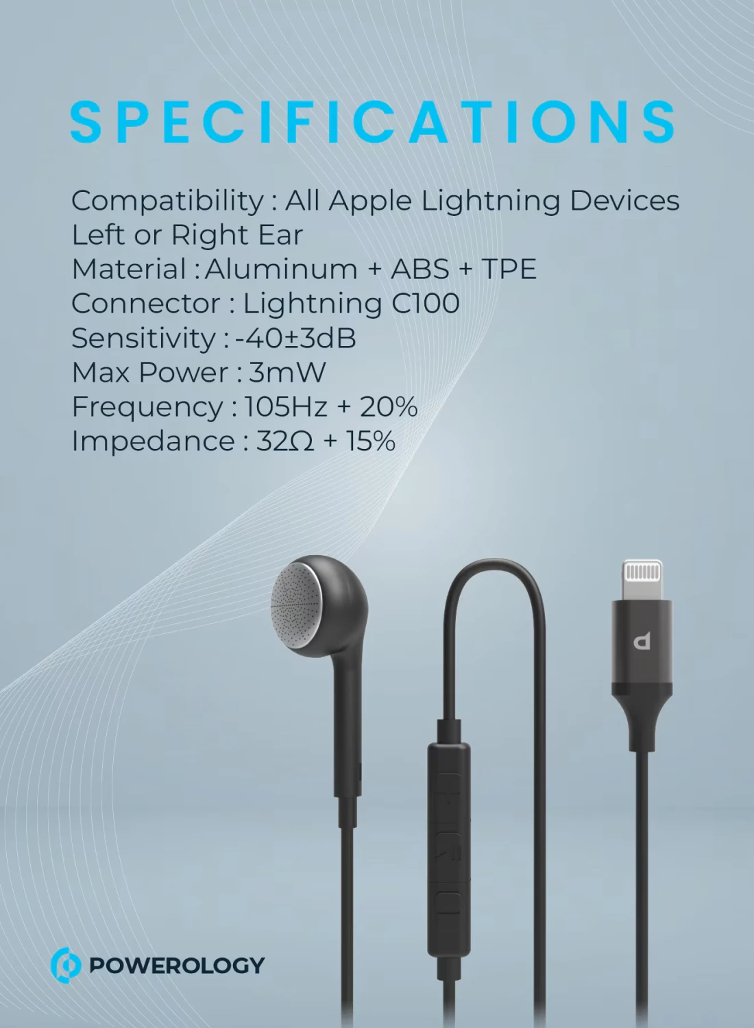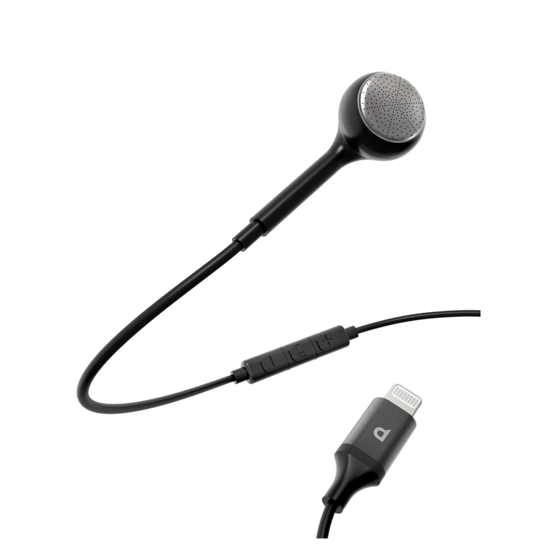 Powerology Single Earphone with MFi Connector, High Clarity Audio, Active In-Line Control Buttons, Siri Enable, HD Sound, 1.2m Cable, Aluminum + ABS + TPE - Black
