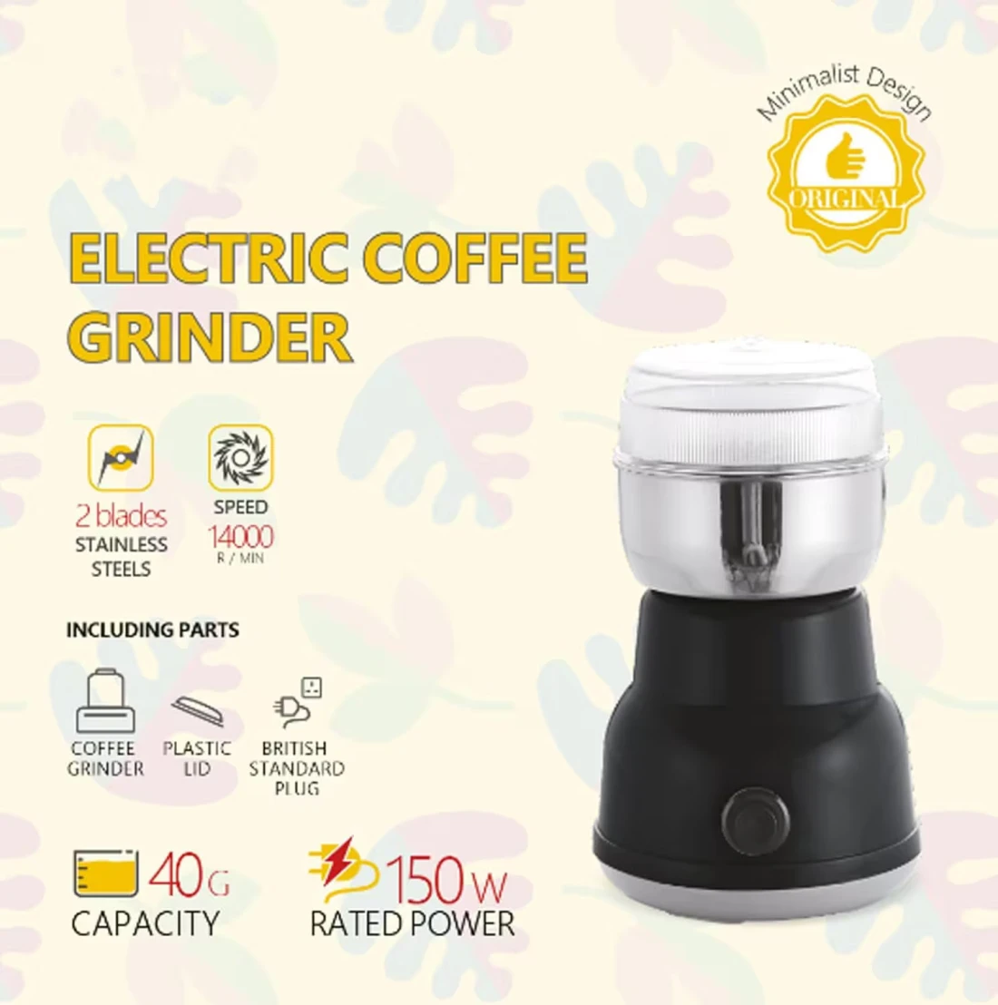 All-in-One Electric Coffee & Spice Grinder – 150W Stainless Steel High-Speed Mixer Grinder, 14,000 RPM, 40g Capacity – Grind Coffee Beans, Herbs, Nuts & Grains in Seconds